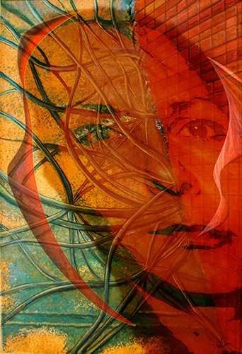 Der Hintergrund wurde auf Leinwand in Acryl angelegt und abfotografiert. Anschließend erfolgte eine digitale Bearbeitung. Das Portrait kann auf Wunsch ausgetauscht werden mit einem Gesicht Ihrer Wahl. Die möglichen Abmessungen des Bildes finden Sie unter